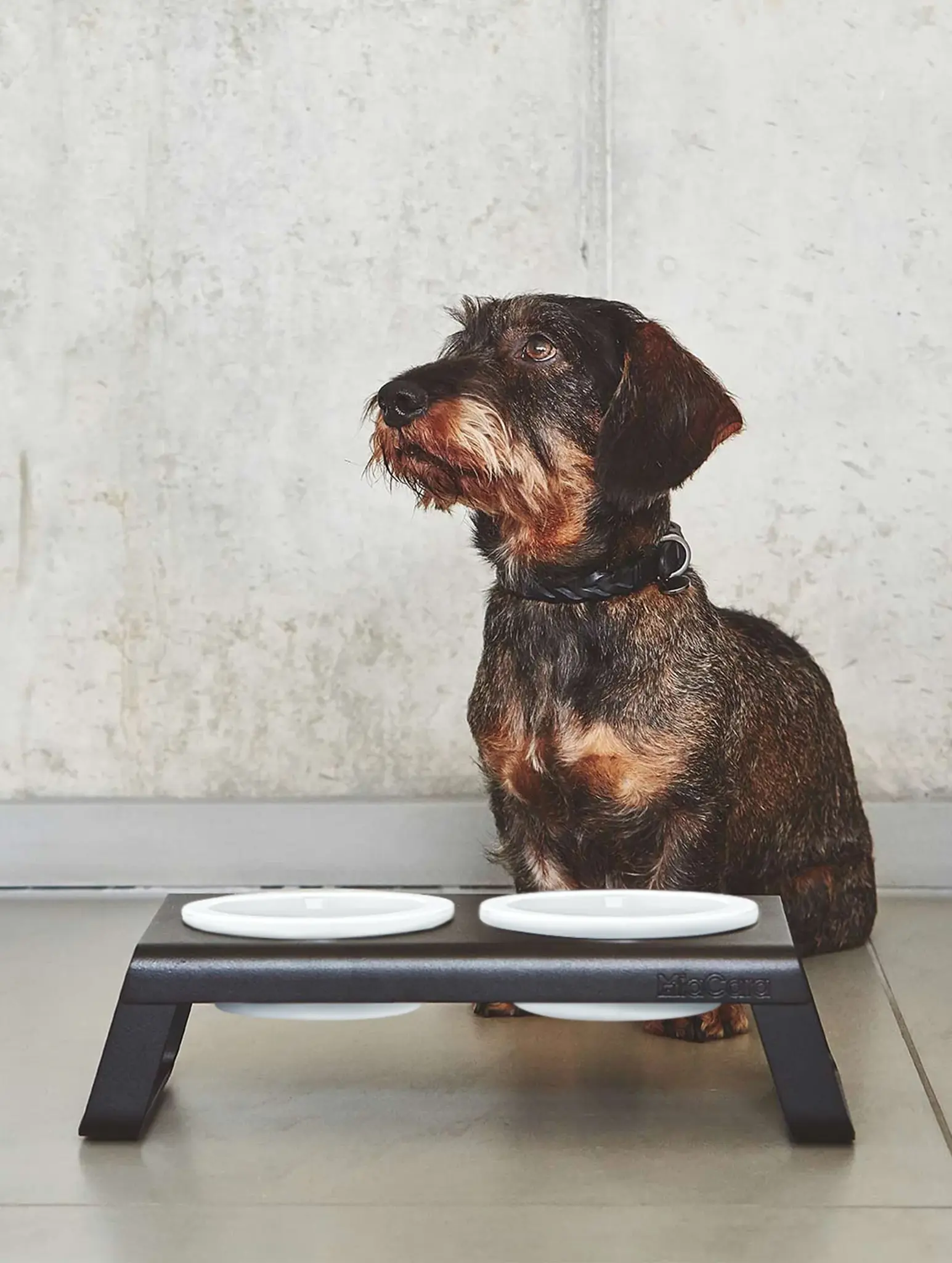 Perfect details: Available in three different sizes, Desco offers dogs of all sizes an ideal feeding height. The Desco bowl stand is supplied with two “Made in Germany” porcelain bowls. The uniquely designed porcelain bowls are not only beautifully shaped, but also particularly high-quality and robust. Practical silicone rings ensure that the removable porcelain bowls stay in place and do not rattle when your pet eats.