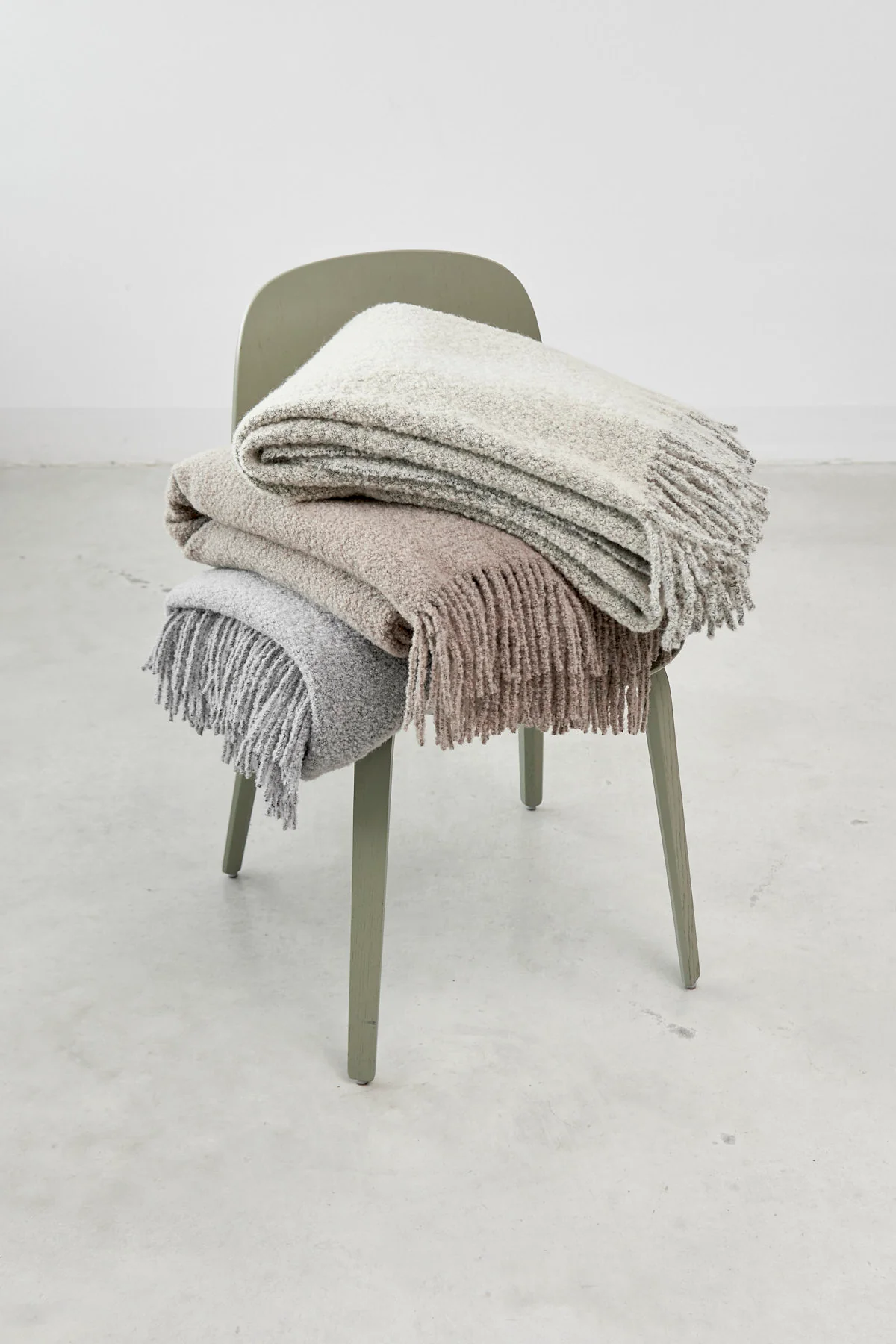 De zachte bouclétextuur voelt niet alleen ongelooflijk aangenaam aan, maar dankzij het hoge wolgehalte van 80% is hij ook van nature temperatuurregulerend, waardoor hij perfect is voor momenten van ontspanning het hele jaar door.